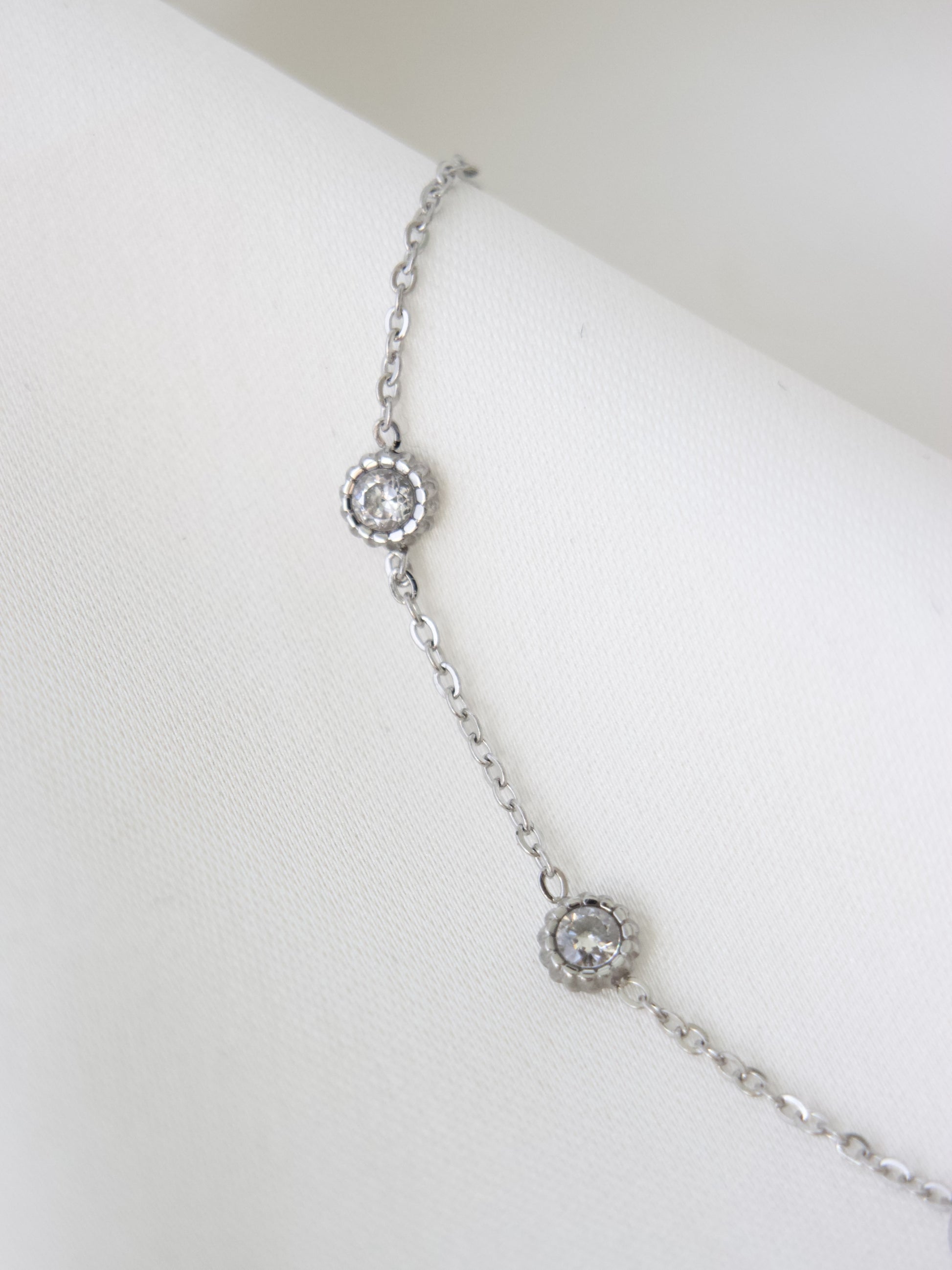 Le bracelet Soleil, en acier inoxydable, est délicatement orné de petites pierres le long de sa chaîne. Comme des soleils, ces pierres brillent, illuminant ainsi votre regard. Ce collier est idéal pour un combo discret et élégant.